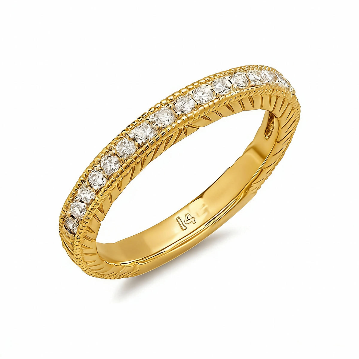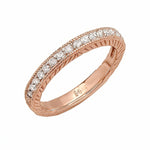 Infused with a vintage charm, the Gracious Eternity Band captivates with a timeless design. This ring features delicate engraving on the walls of the band and milgrained edges that frame a row of pavé diamonds. Blending radiant sparkle with graceful wearability, it's a beautiful symbol of enduring love.