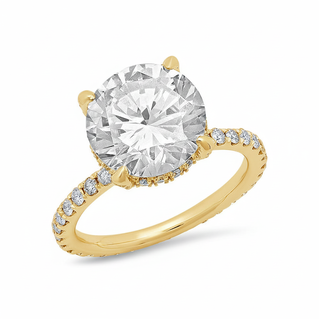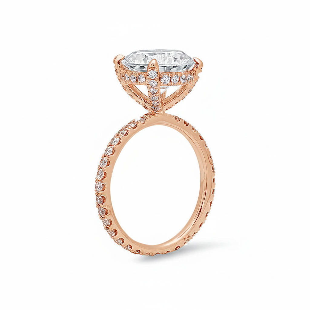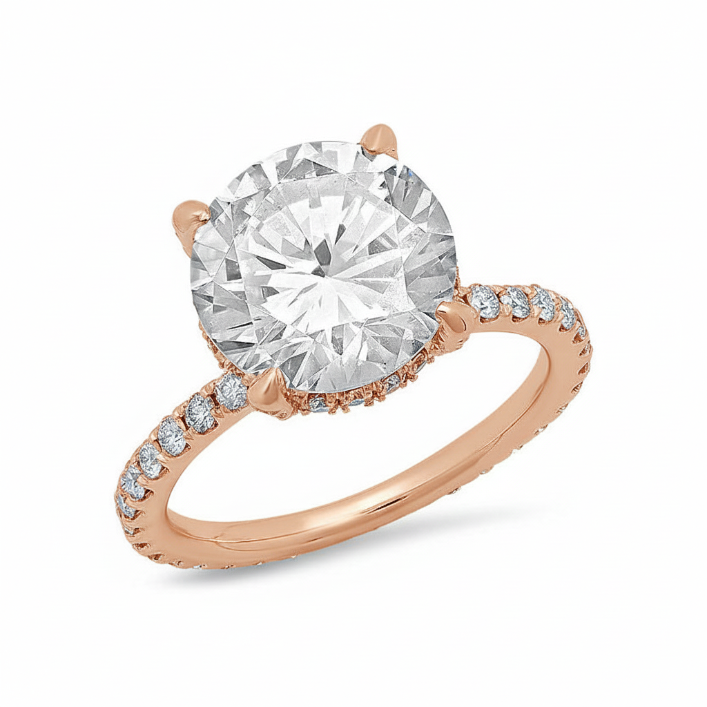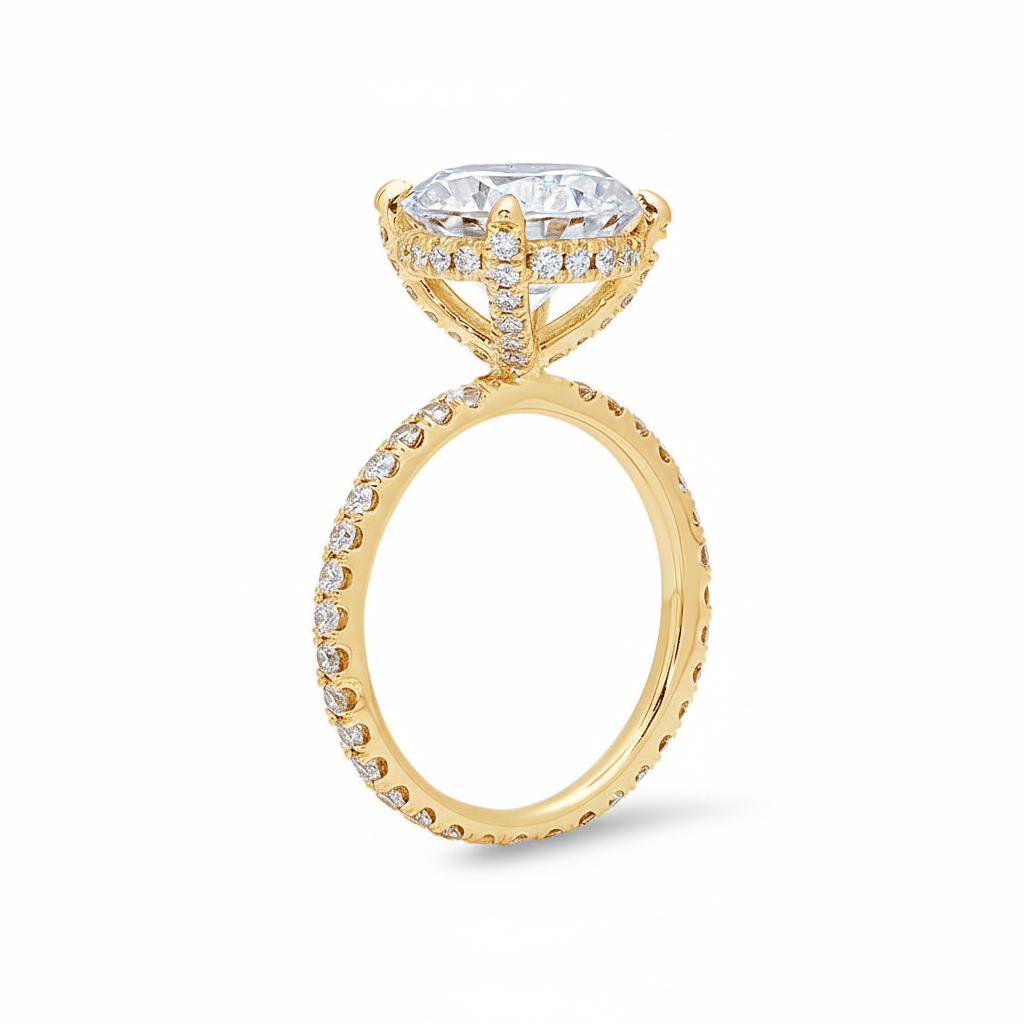 Designed for timeless elegance and everyday sparkle, the Gillian Engagement Ring is a beautiful symbol of your story. A brilliant-cut diamond is held in a classic four-claw setting with a pavé-set halo and a diamond-encrusted gallery. The pavé-set eternity band adds another layer of brilliance, ensuring this ring catches the light from every angle. Ideal for proposals and anniversaries, Gillian pairs classic elegance with modern refinement for a look that is both comfortable and secure.