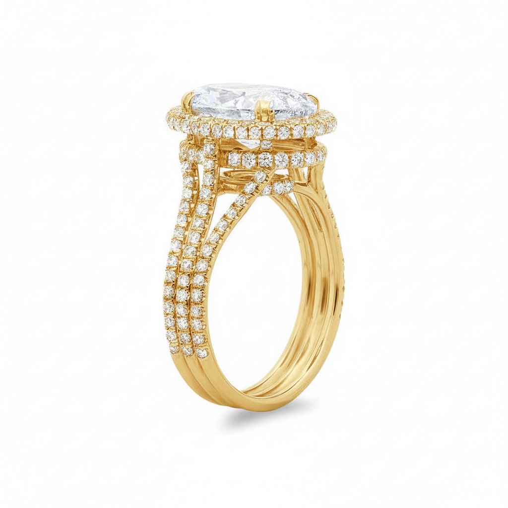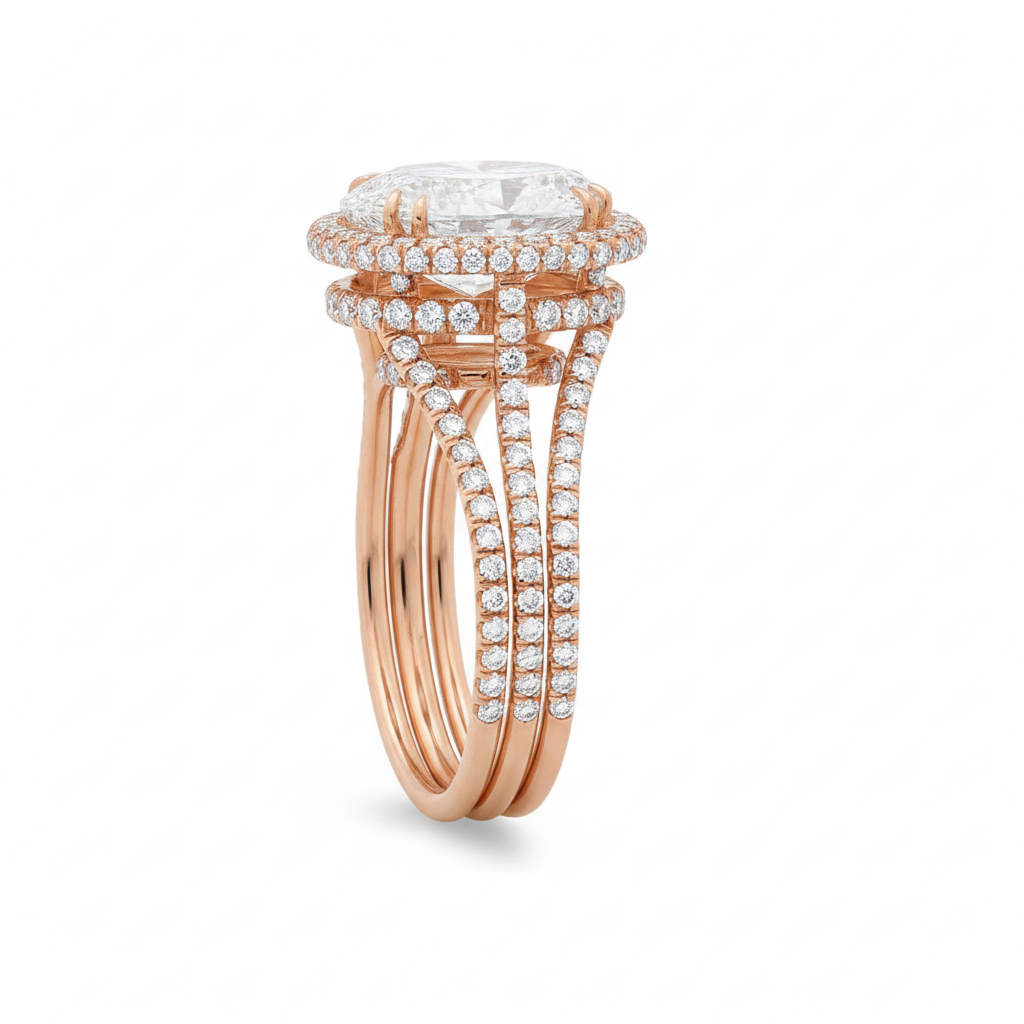 The Marin Engagement Ring captivates with a timeless classic style and a refined design that sparkles with every movement. An oval-cut center stone is held in double micro-prong settings and surrounded by a pavé-set belt and halo. The ring also features a split three-way shank half-eternity band complete with pave-set diamonds. Designed for everyday elegance, the Marin blends romance with refined simplicity to celebrate lasting love.