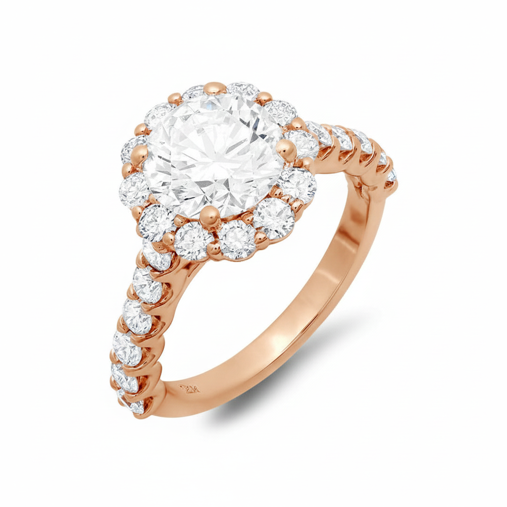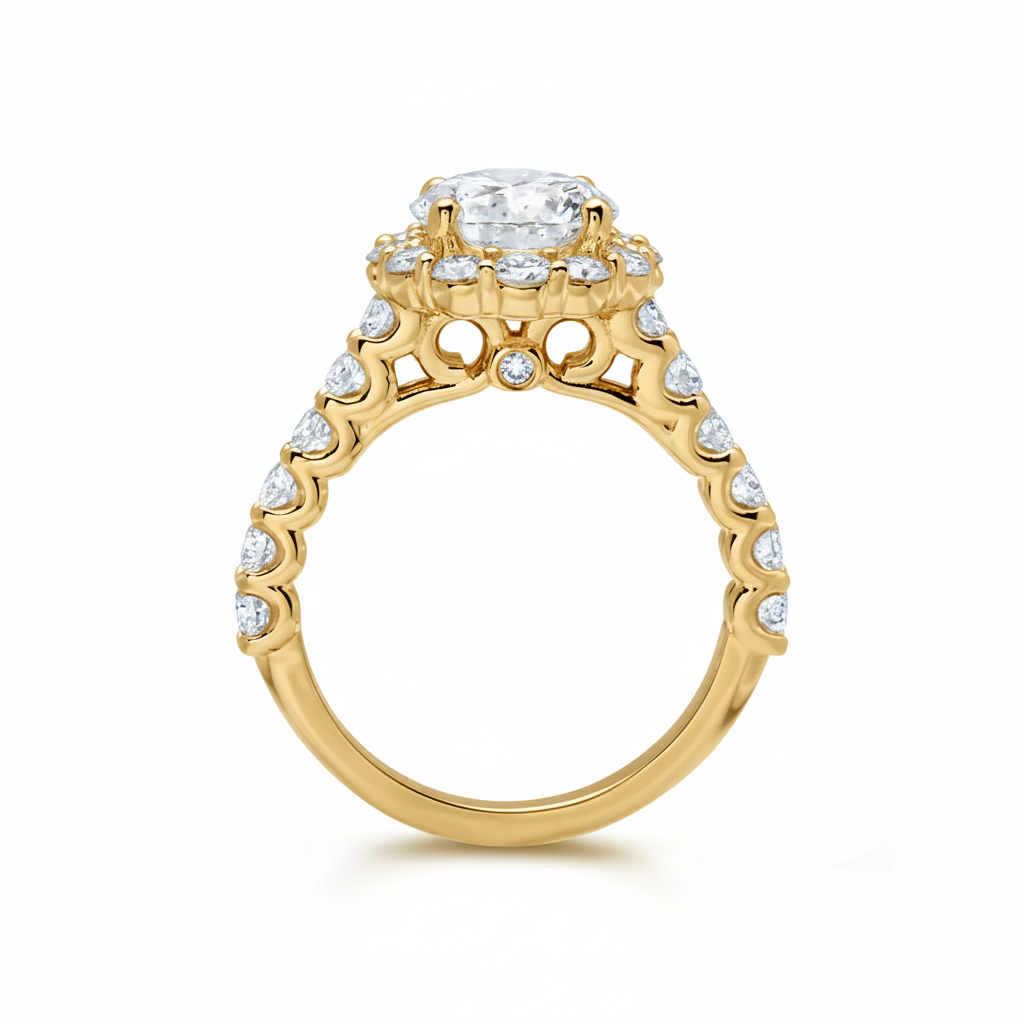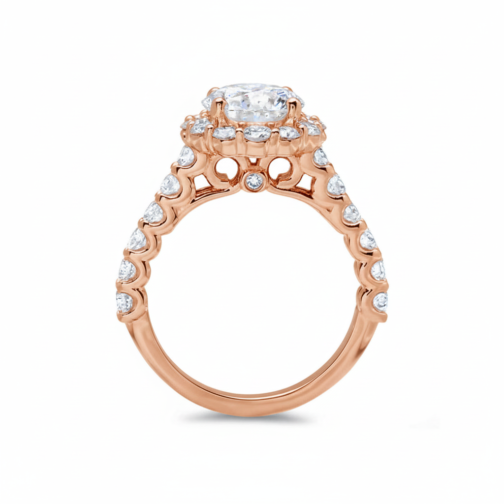 Brilliant in every way, the Patras Engagement Ring is a timeless silhouette with a refined setting. This diamond ring features a cathedral-style setting with round brilliant diamonds set in a beautiful halo flower-like design and a "U" style pave shank. At the center is a brilliant cut diamond in a four-prong setting. This ring delivers a brilliant glow that complements a center stone or shines on its own. Designed for everyday wear and special moments alike, it offers classic elegance with modern sparkle to celebrate your forever.