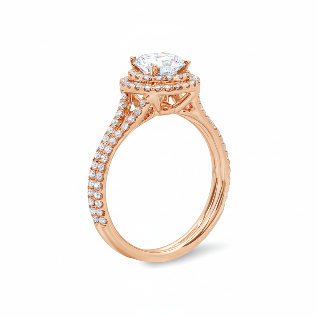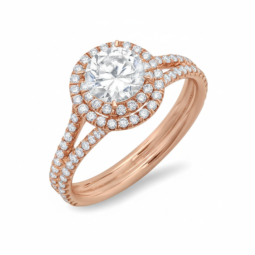 The San Jose Engagement Ring captures timeless elegance with a classic silhouette. It features a split shank and a double step halo with pavé-set diamonds, arranged in a "U" shape around your choice of center diamond. With approximately 0.50 carats of total diamond weight (excluding the center), this ring is designed to sparkle in every light, enhancing the center stone while offering durable everyday wear.