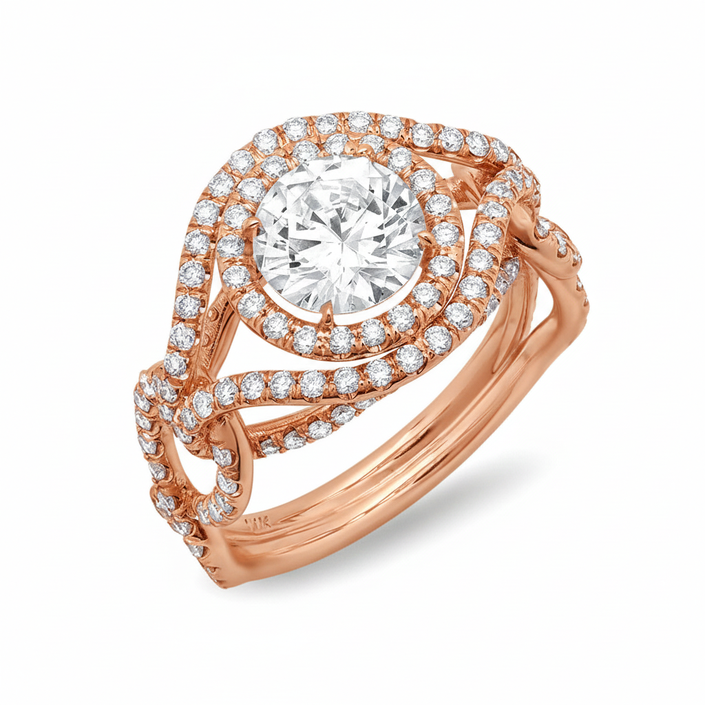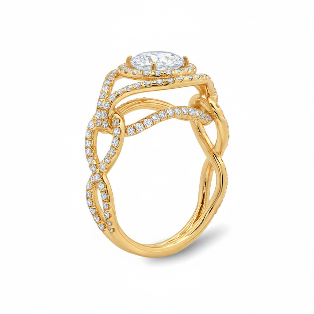 Celebrate lavishly with the Trapani Engagement Ring, a timeless and elegant piece. The centerpiece of this ring is a brilliant-cut diamond, held in a four-prong setting and surrounded by a pavé-set halo. Pavé-set loops make up the band, creating a radiant sparkle that keeps the center stone as the focal point. The opulent diamonds and classic silhouette make this a perfect symbol of love for couples seeking a sophisticated look.