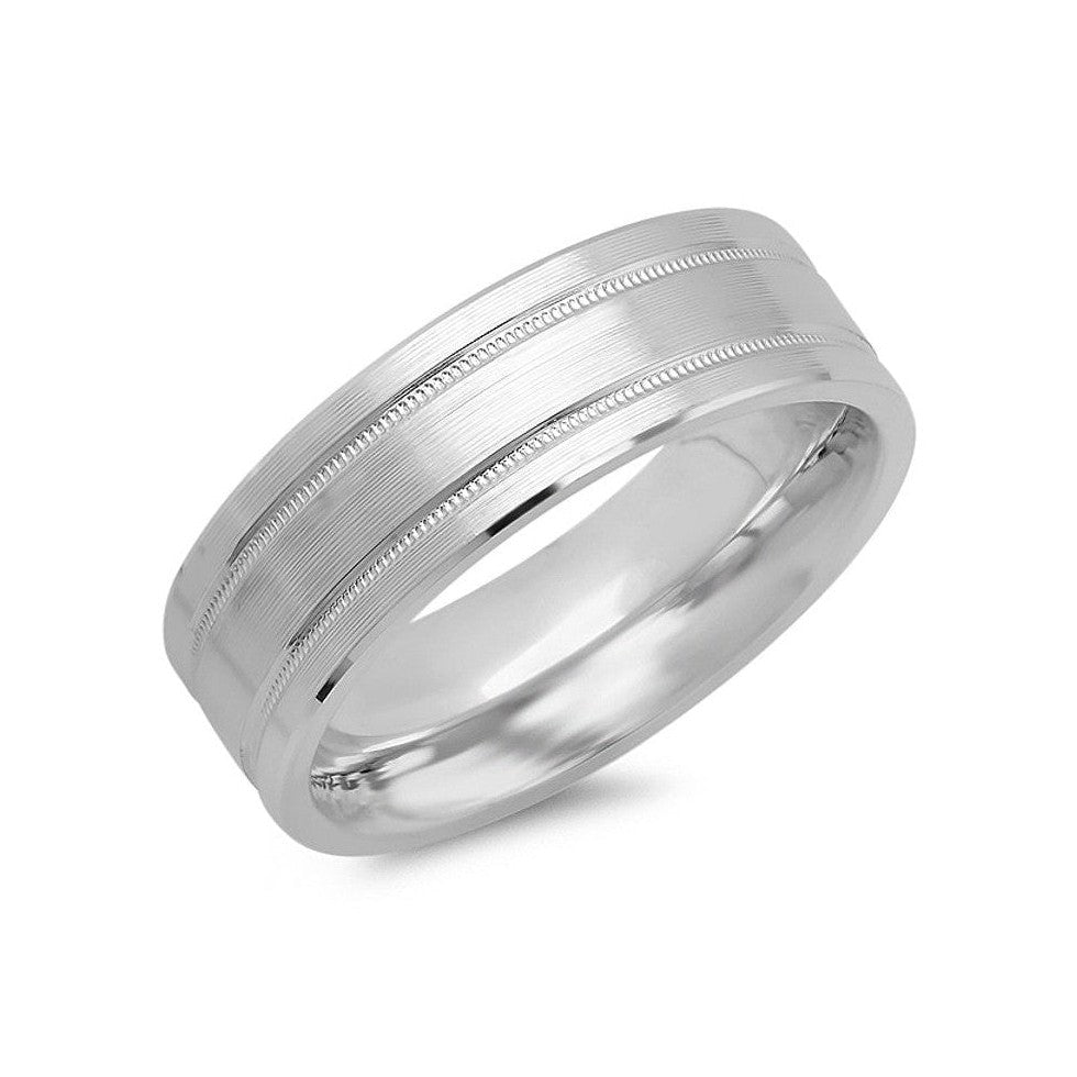 This Men's Band is a modern, masculine wedding ring featuring a sleek, contemporary style. A subtle beveled edge catches the eye as you move, while two parallel milgrain lines and a satin finish add a distinctive design. Designed for comfort and durability, this ring is the perfect blend of style and sentiment—ideal for the wedding day and beyond.