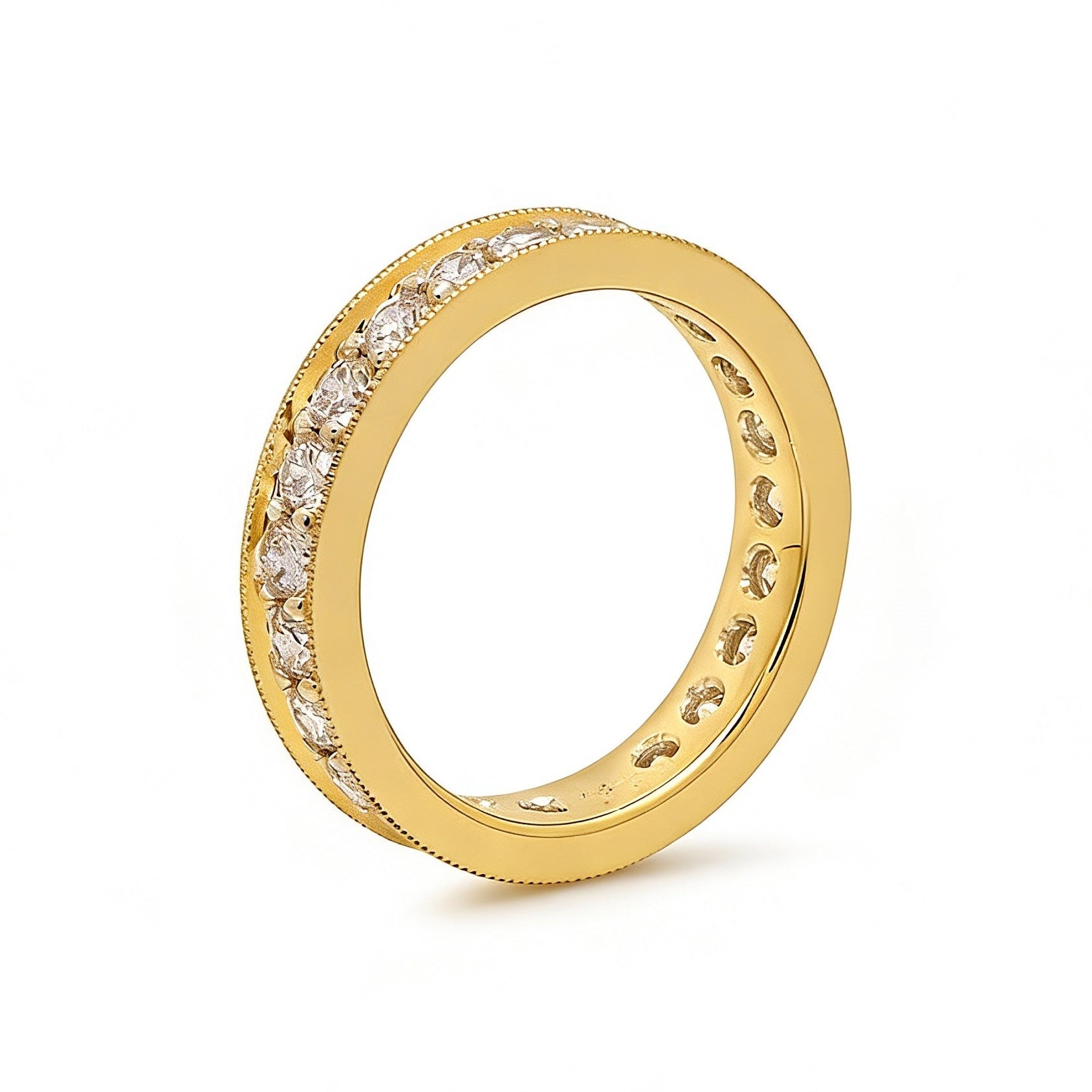 A classic and elegant choice, the Cambridge Wedding Band is an eternity-style ring that delivers a continuous glow. The polished band features a beautiful pavé setting of round brilliant diamonds, finished with a charming milgrain border. This ring is designed to be a timeless statement piece, perfect for everyday elegance.